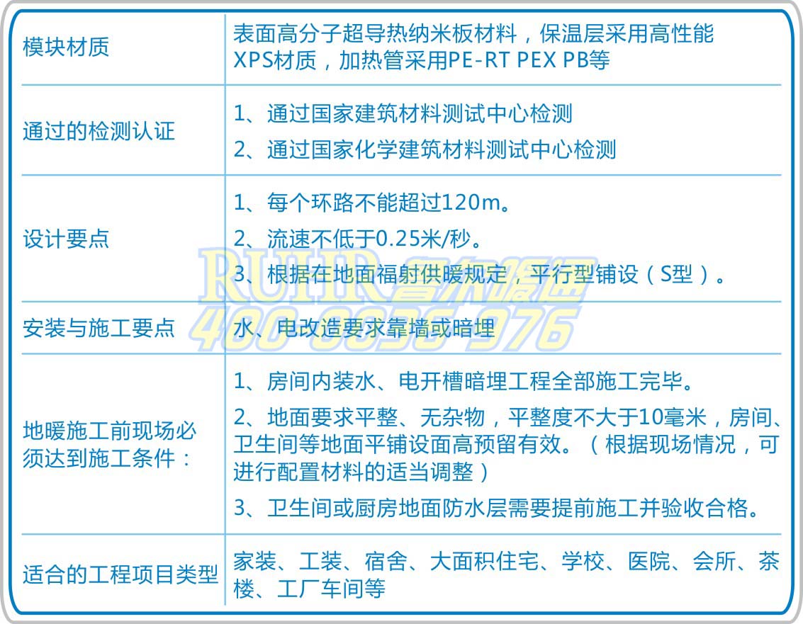1、 节能,鲁尔超导热地暖模块采用德国鲁尔研发的航空超导纳米材料技术,该材料的导热速度比铝板快6倍。