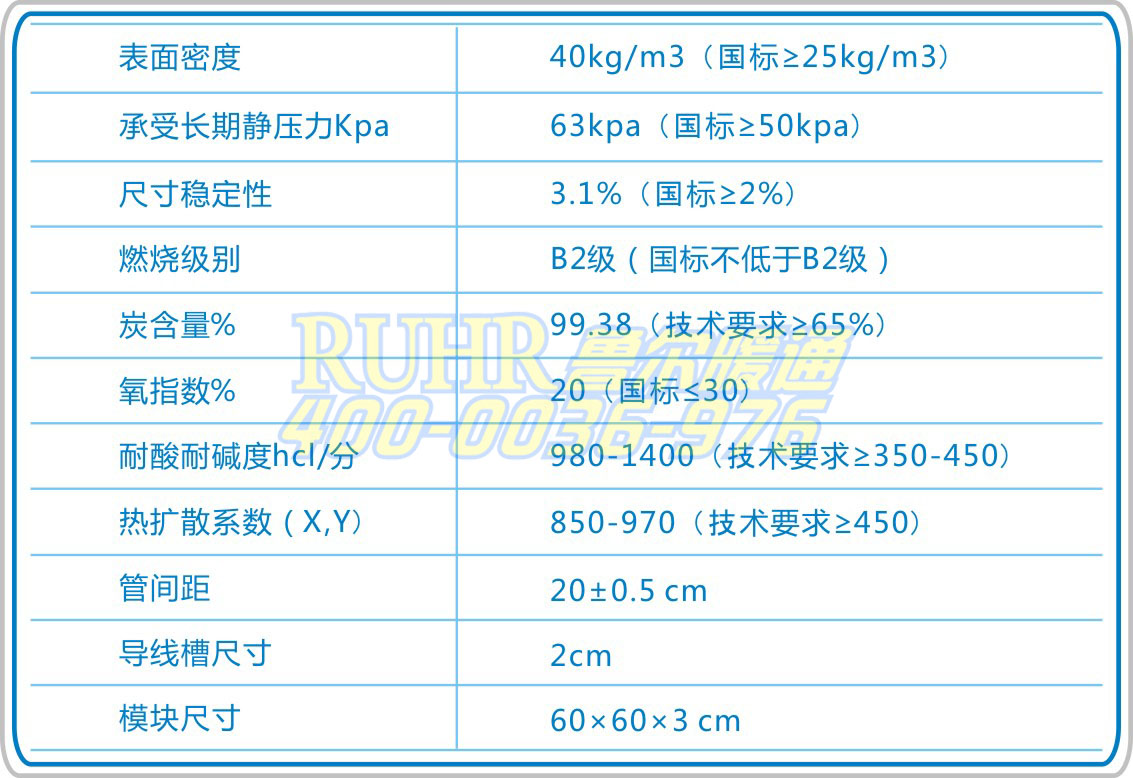 鲁尔严格贯彻ISO9001:2000国际质量管理体系的运行,2013年2月份获得国家实用新型专利认证证书 。该模块表面超导材料是德国鲁尔公司于上世纪90年代研发的一种非金属高分子材料(俗名:碳晶硅)它色泽灰黑,质软,具有金属光泽,莫氏硬度1-2、比重2.2-2.5、容量1.5-1.8具有很强的化学稳定性,可耐470℃的高温。同时它耐酸、耐碱、耐有机溶剂,尤其是它具有良好的导热性能,它比铝板导热速度快6倍。