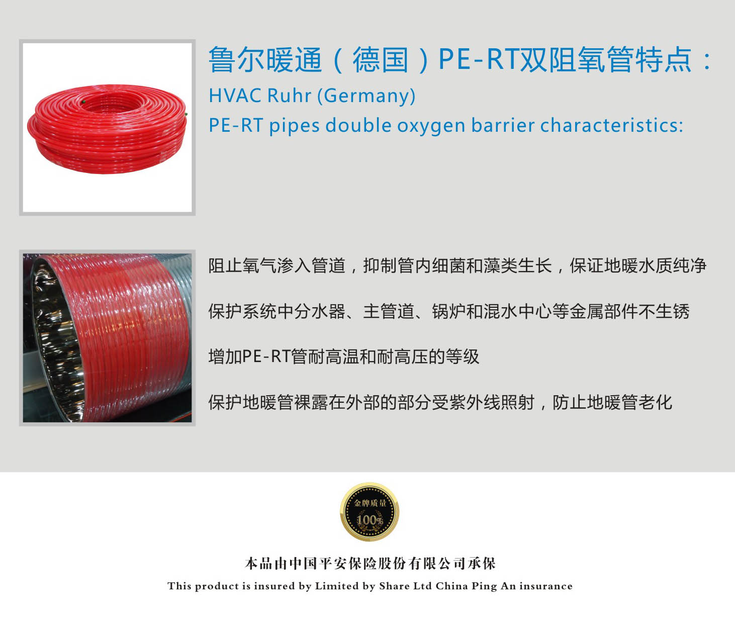 鲁尔PE-RT双阻氧管是在乙烯和辛烯共聚物产生时,在共聚链体主链位置与短支链位置添加阻氧剂(TBC中文名:对叔丁基邻苯二酚),并采用EVOH技术,将高分子EVOH阻氧材料复合在PE-RT管壁外,达到双阻氧效果。